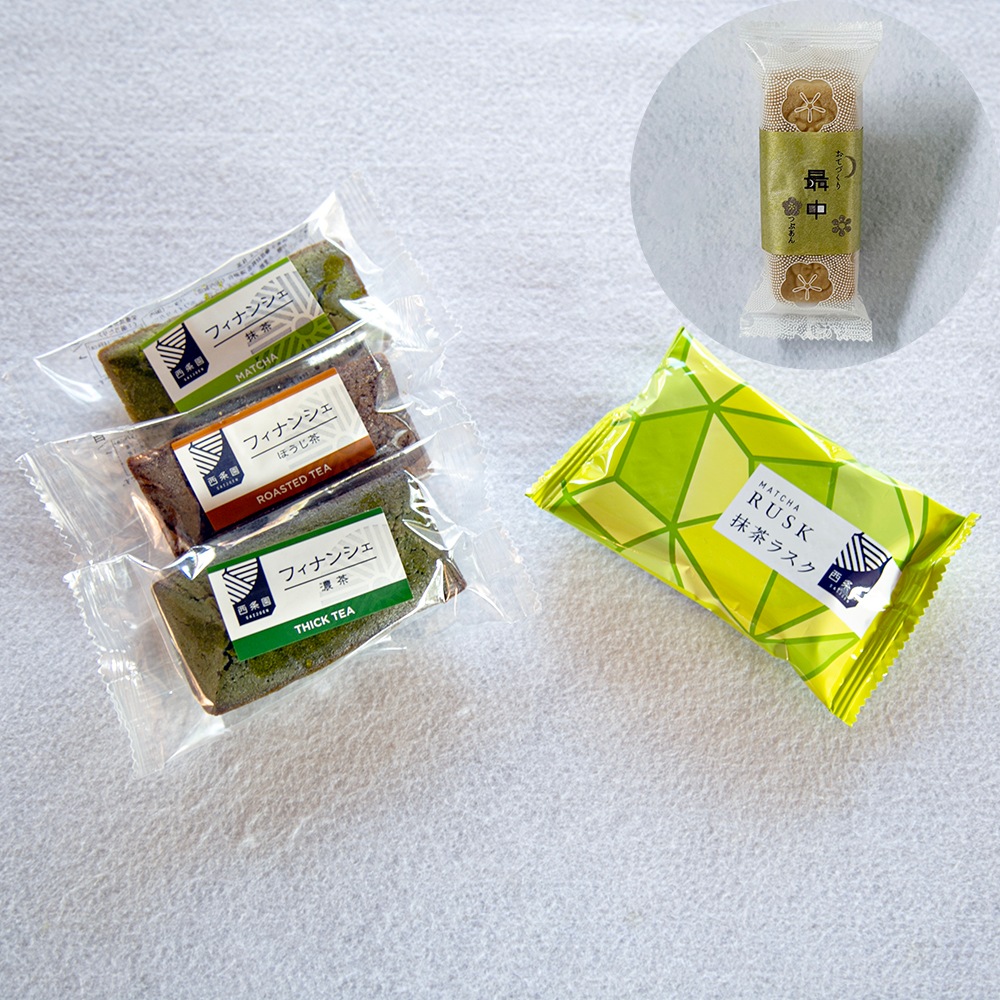 内容:抹茶ラスク(2枚×1袋)、抹茶フィナンシェ(1個)、ほうじ茶フィナンシェ(1個)、濃茶フィナンシェ(1個)、おてづくり最中 つぶあん(1個)